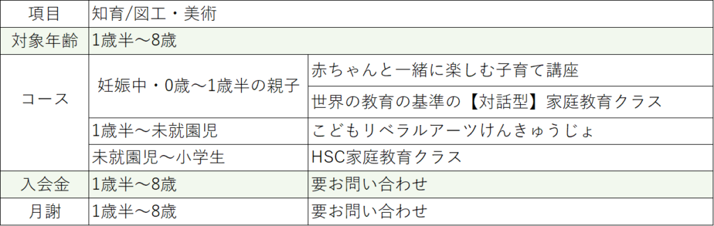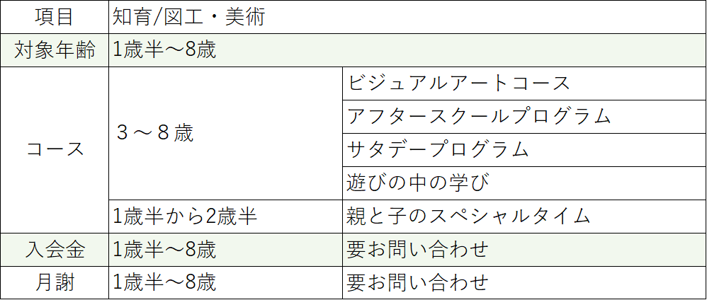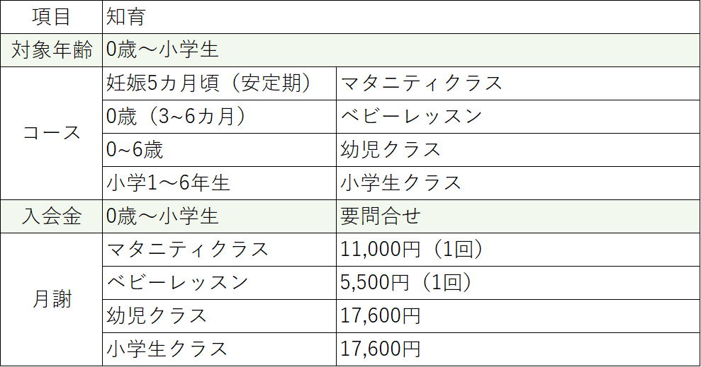 見た限りですと、幼児の基礎音楽というものがありましたが、その他ピアノコースなどもありますのでぜひ気になる方は問い合わせてみてください。