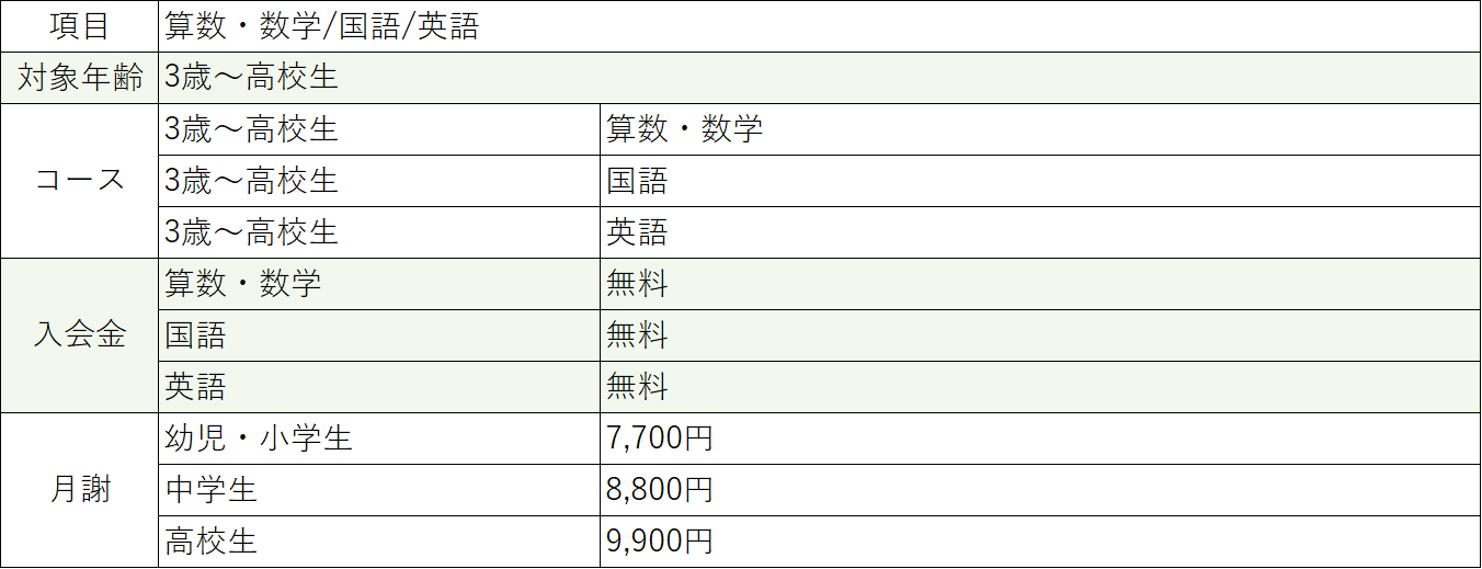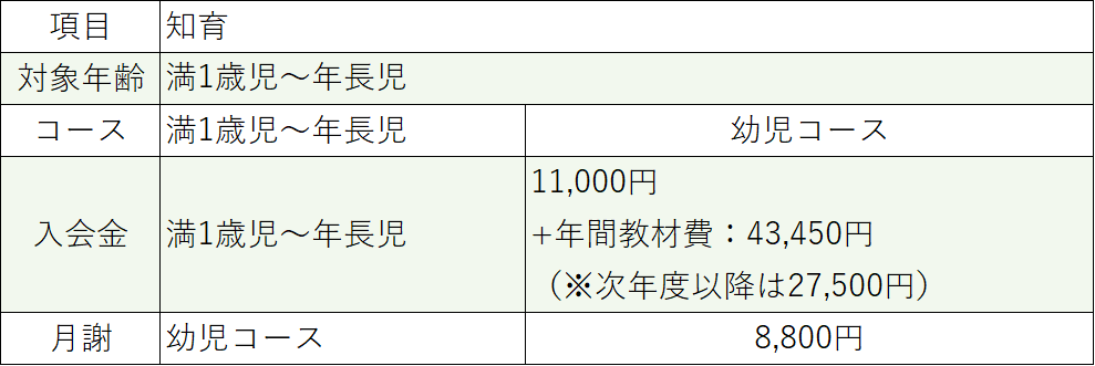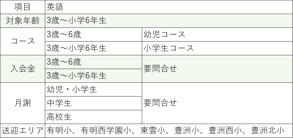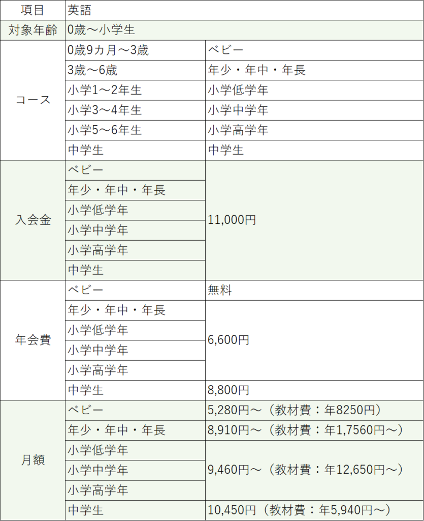 残念ながら、入会費・月額料金・何歳からといった情報はなかったため、店頭にいって・もしくは問い合わせての確認になります。