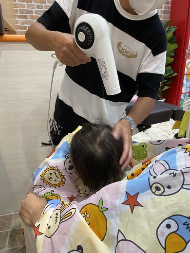 お子さんが怖がったり泣いてしまった場合には、ママやパパなどご家族が抱っこをしてのヘアカットが出来ますし、