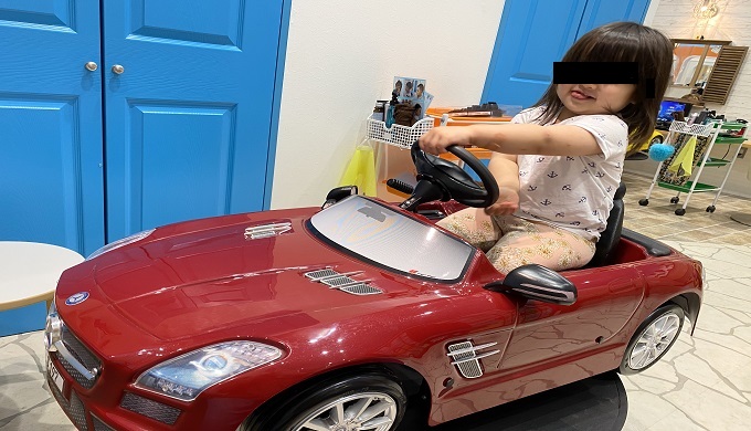 車はハンドルが回るタイプなので、髪を切って頂いている間ずーっとくるくるーとハンドルを回して遊ぶ娘。